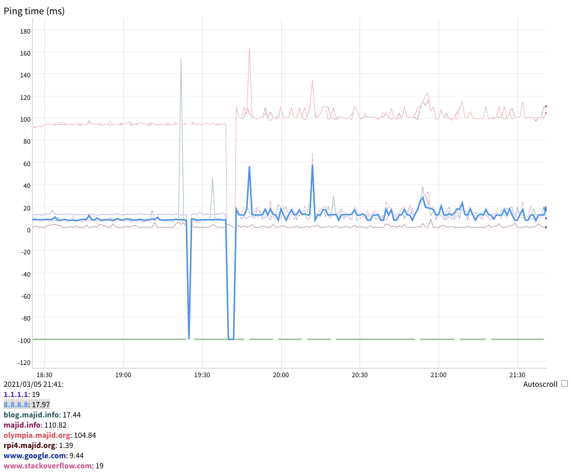 Not everything is perfect, of course. Ping times have risen slightly, and are more variable, as can be expected of a wireless network with layers of VPN processing latency added.