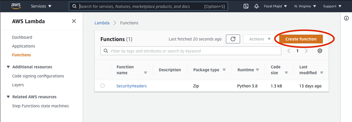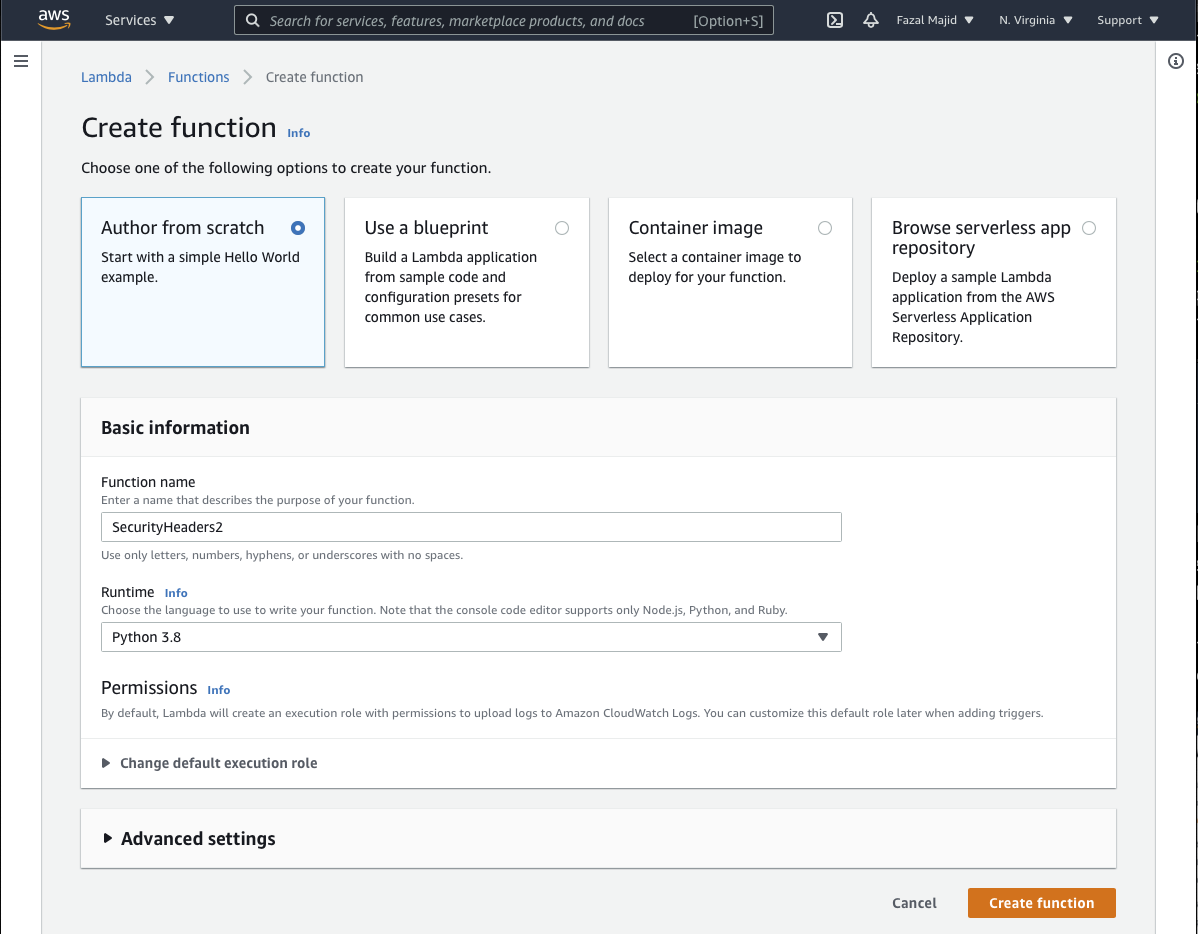 Then choose Author from scratch, give a name (in my case, SecurityHeaders) and choose the Python 3.8 runtime.