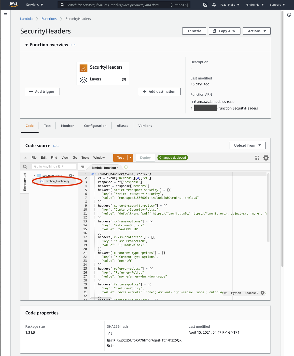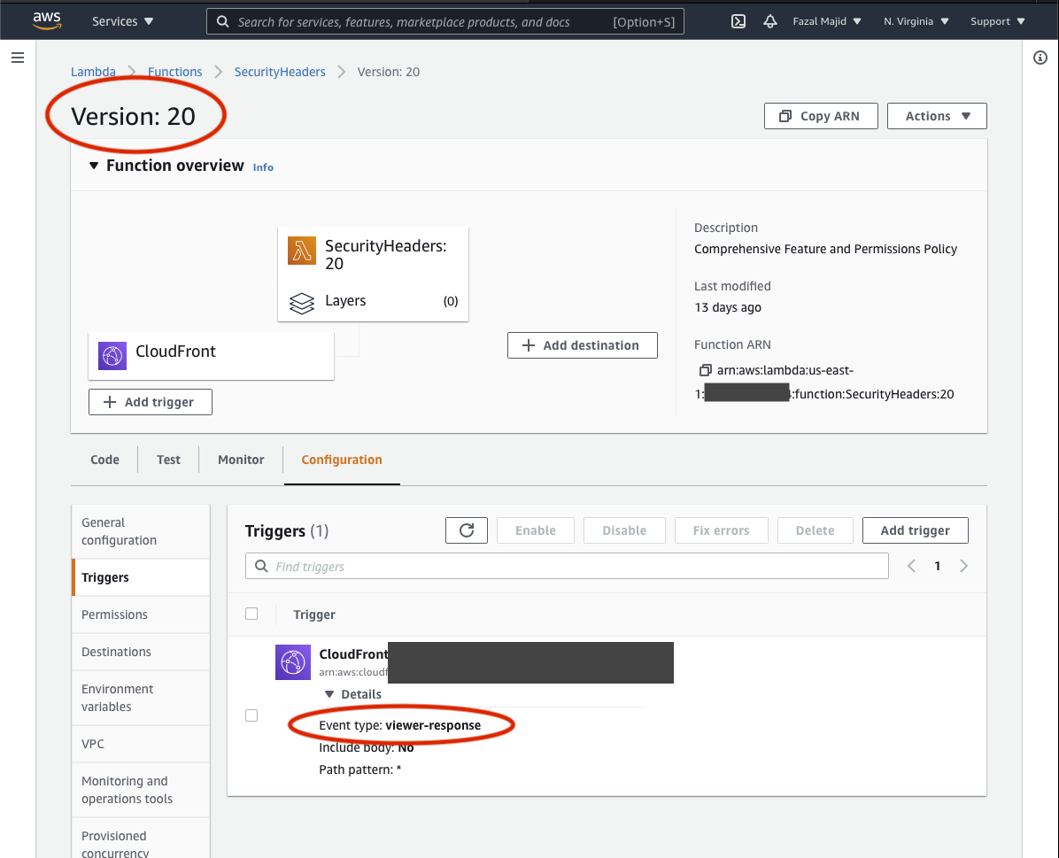 Click the disclaimer checkbox and press the Deploy button. It will take a few minutes to deploy to CloudFront, and then you can use curl or your browser’s developer console to verify the headers are sent. I include a header X-FM-Version to verify which version of the function was deployed.