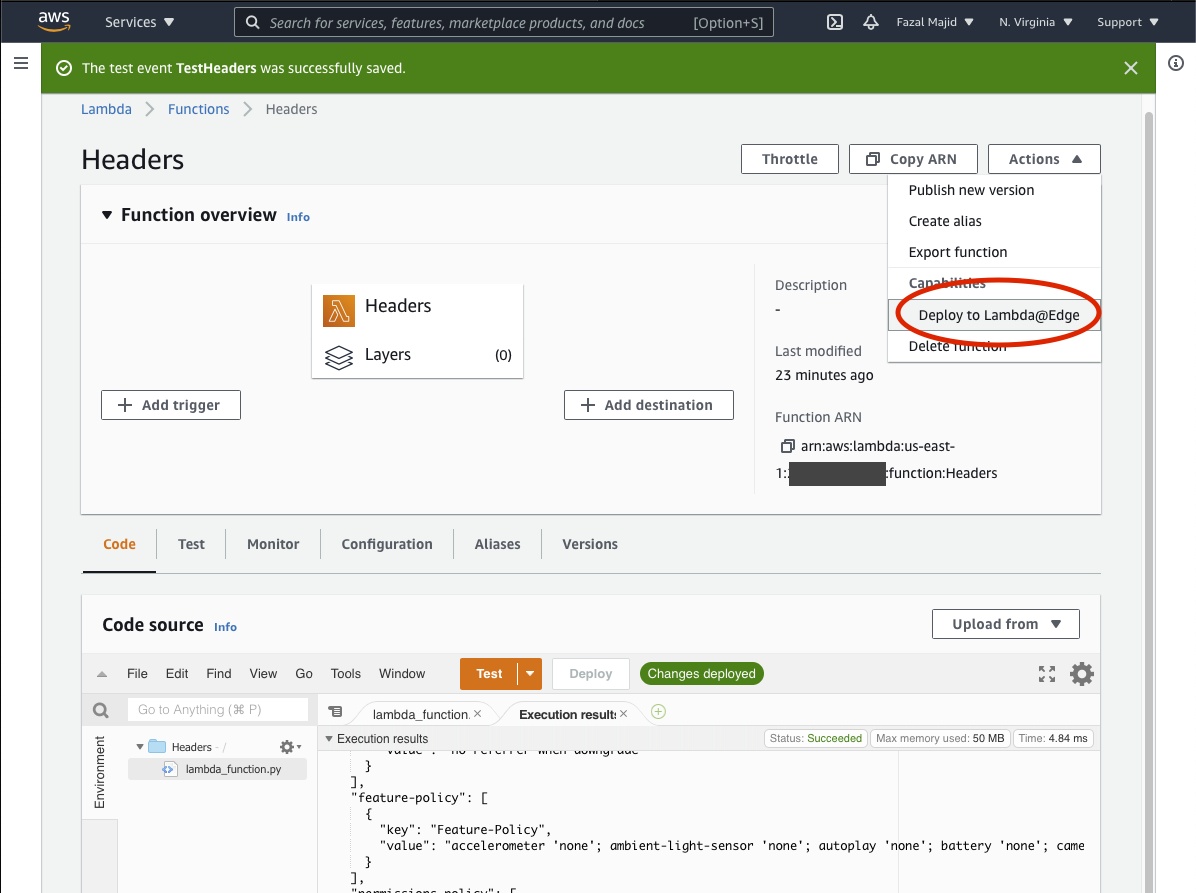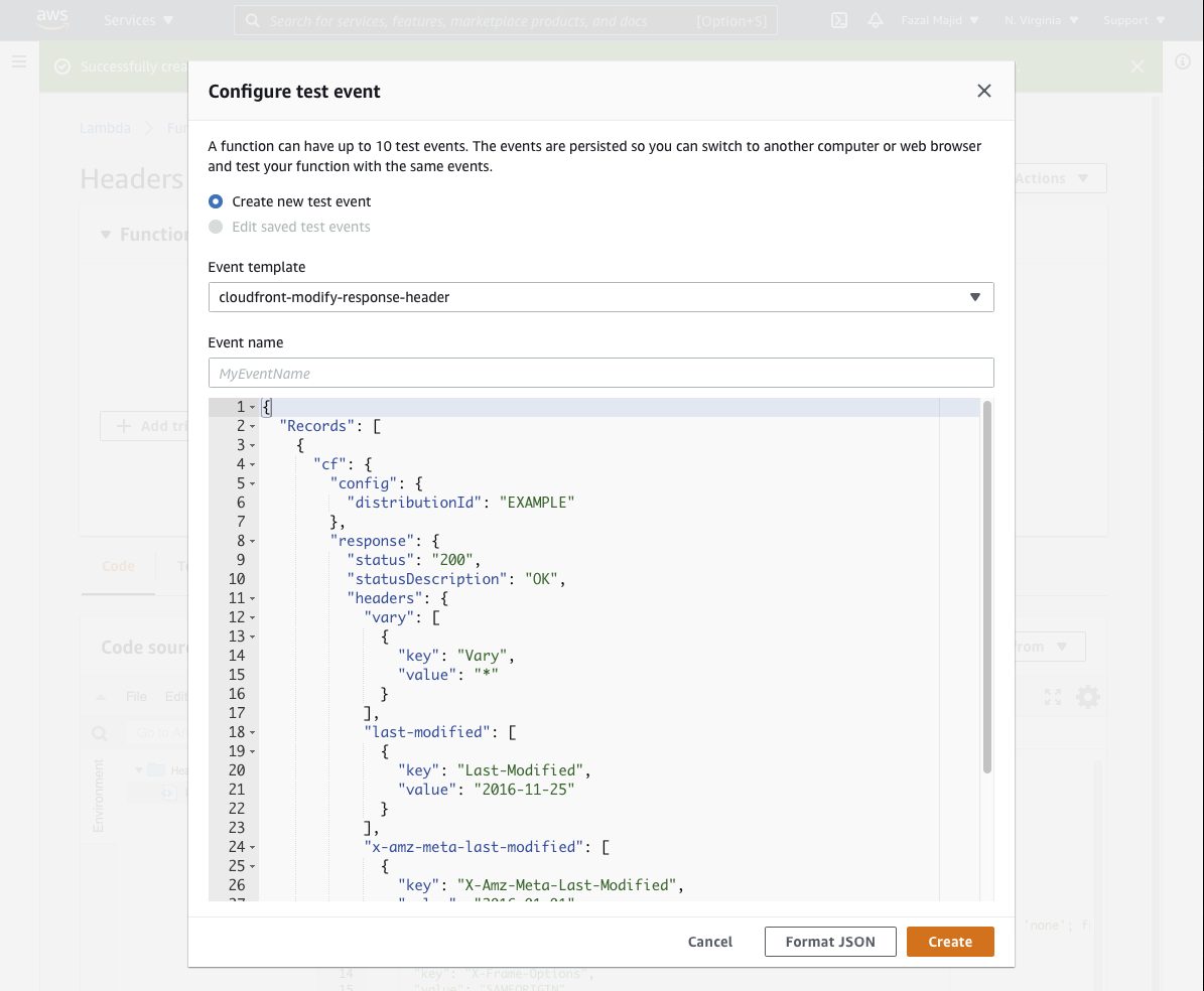 Click on Deploy (which is really more of a Save button), then press the orange Test button. Choose the Event Template cloudfront-modify-response-header. Save it, e.g. TestHeaders and click again on the Test button to verify the function executes without exceptions.
