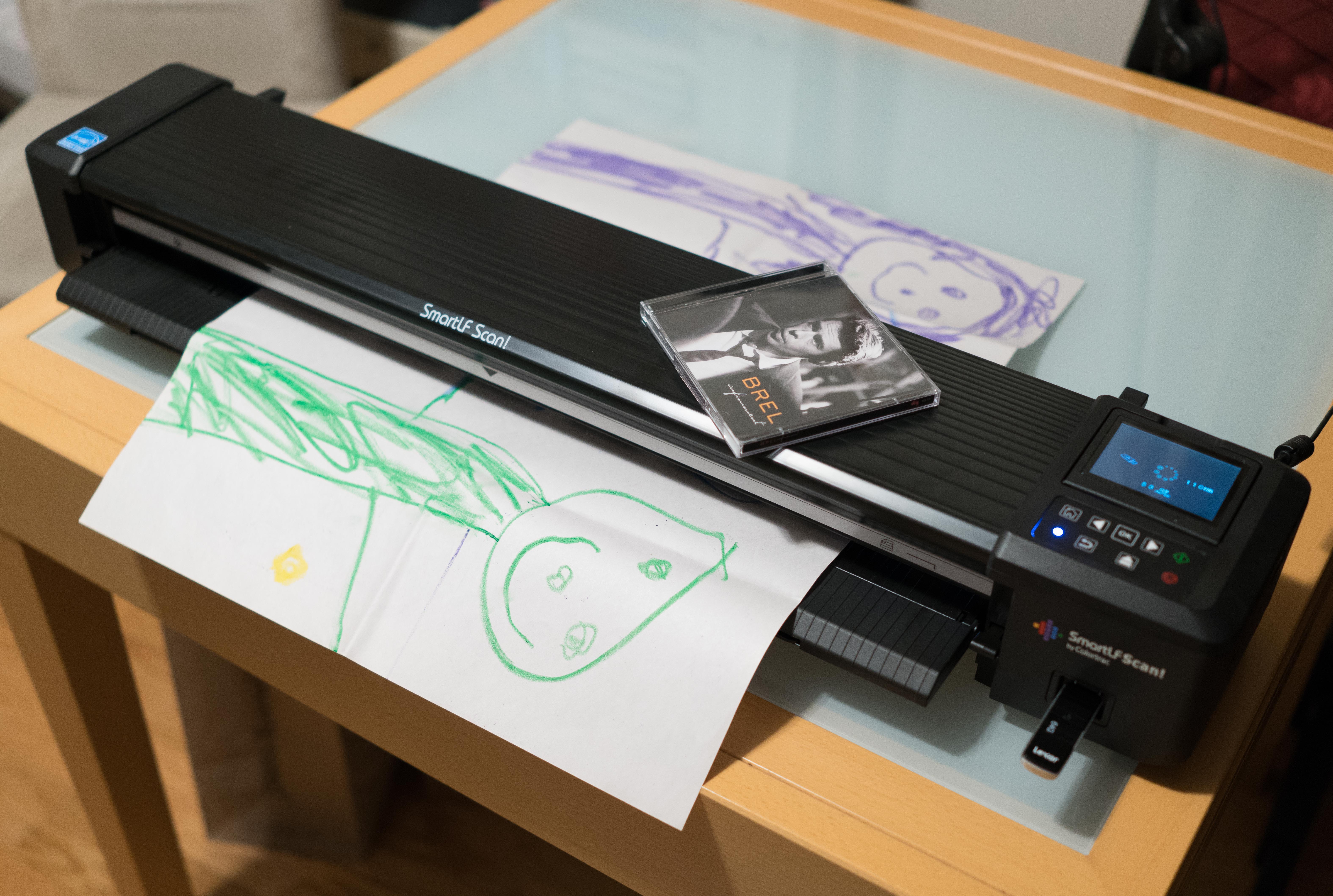 I decided I would scan them, then file them in Ito-Ya Art Profolios, and possibly make annual photobooks for the grandparents. This brings up the logistical challenge of digitizing such large pieces. Most flatbed scanners are limited to 8.5×14″ (US Legal) format. Some like the Epson Expression 11000XL and 12000XL can scan 11×17″ (A3), as can the Fujitsu ScanSnap SV600 book scanner, but that is not fully adequate either. One option would be to fold the artwork up, scan portions then stitch them together in AutoPanoGiga or Photoshop, but that would be extremely cumbersome, specially when you have to do a couple per day. I do not have access to a color copier at my office, and most of these are only A3 anyway.