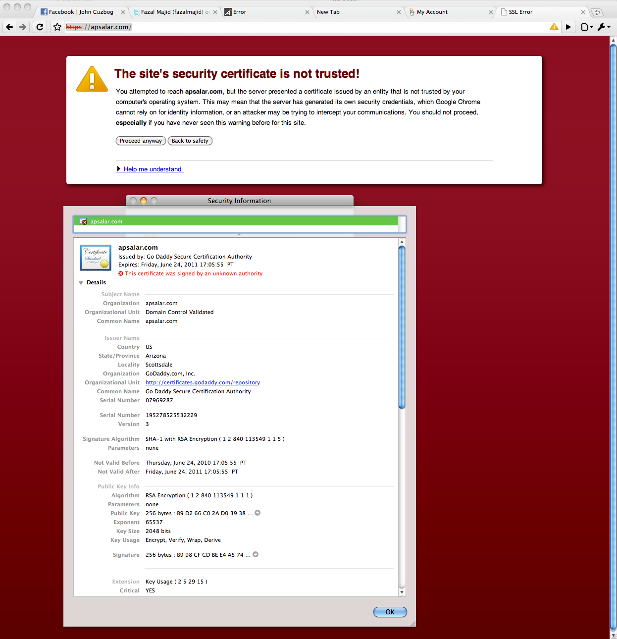 Immediately after switching from my earlier “snake oil” self-signed test certificate to the production certificate, I saw SSL errors on Google Chrome for Mac and Safari for Mac, i.e. the two browsers that use OS X’s built-in crypto and certificate store. I suppose I should have tested the certificate on another server before going live, but I trusted GoDaddy (they are my DNS registrars, and competent, if garish).